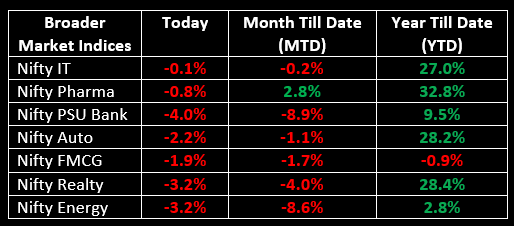 Among sectors, all indices ended in the red, with the PSU Bank index declining by nearly 4%, weighed down by weak quarterly business performance. Metal, realty, energy, PSU, power, and oil & gas sectors also faced sharp declines, each dropping by approximately 3%.