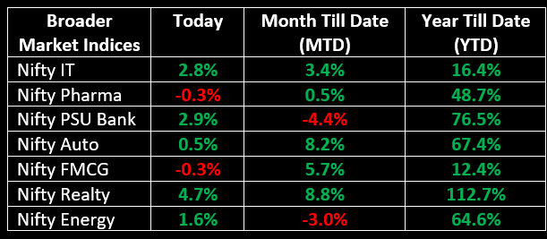 Among sectoral indices, BSE Realty led with a gain of 4.85%, followed by BSE Industrials and capital goods indices, both jumping over 3.7% and 3.4%, respectively. Other gainers included Oil & Gas, Power, Telecommunication, and IT sectors, each up by over 2.5%.