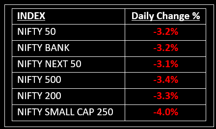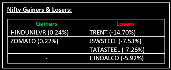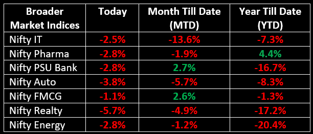 Sectorally, all indices ended in the red, with the Metal index plunging by 6.7%, the Realty index down by 5.6%, and sectors like PSU Bank, Energy, and IT losing between 2.5-4%.