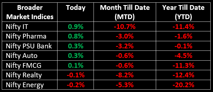 Among broader indices, the BSE Midcap index rose by 0.3%, while the Smallcap index slipped 0.2%. On the sectoral front, all indices ended in the green, except for Energy, Infra and Realty.