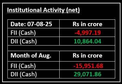 On August 7, Indian indices opened lower despite positive global markets and remained in the negative territory for most of the day. Nifty slipped below 24,350 intraday, but a sharp recovery in the final hour helped close near the day's high. Indices remained under pressure for most of the session due to US President Donald Trump's imposition of an additional 25% tariff on India over Russian oil imports and the possibility of 100% tariffs on imported semiconductors.