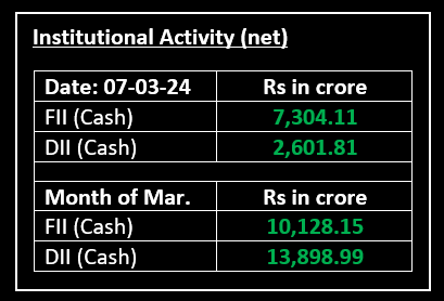 On March 7, the market failed to capitalize on its initial gains, concluding the session rangebound and nearly unchanged. At the onset, benchmark indices surged to new all-time highs, with the Nifty surpassing the 22,500 mark for the first time. The decrease in volatility, falling below the 14 mark, created a favorable setting for bullish sentiment. India VIX experienced a 4.77% decline to 13.61, marking its lowest level since January 16. In terms of sectors, banking, oil & gas, auto, and realty closed in the negative, while metal, capital goods, media, and FMCG saw gains of 1-2.5%.