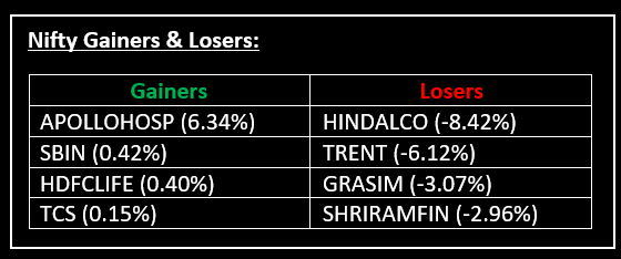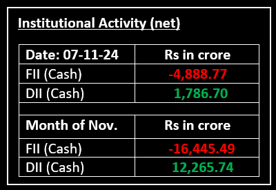 On November 7th, Indian benchmark indices erased gains from previous sessions, ending a two-day winning streak due to broad-based selling across sectors as investors stayed cautious ahead of the Federal Open Market Committee (FOMC) outcome later tonight. Top Gainer: APOLLOHOSP | Top Loser: HINDALCO