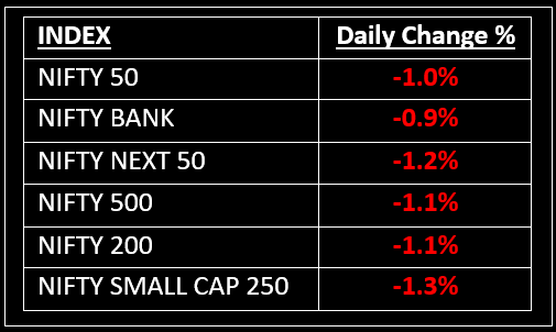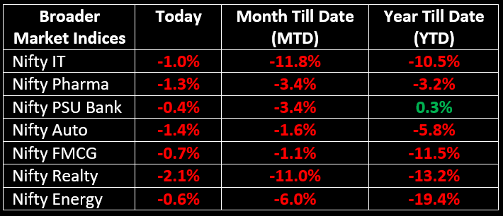 Among broader indices, the BSE Midcap index shed 1.6%, while the BSE Smallcap index fell 1%. All sectoral indices ended in the red, with metal, realty, pharma, auto, private bank and consumer durables down by 1-2%.