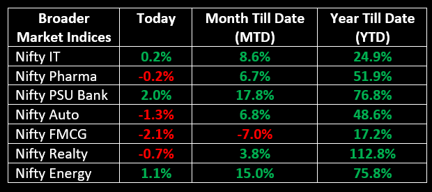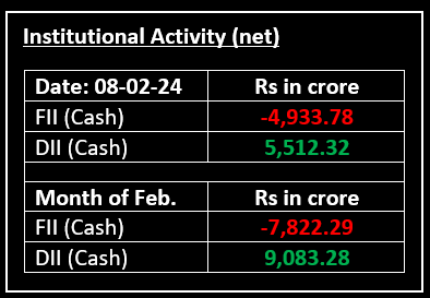 On February 8, the Indian equity benchmarks closed significantly lower after the Reserve Bank of India (RBI) decided to maintain key interest rates unchanged. Over the past few weeks, the market has experienced fluctuations within a certain range, leading investors to exercise caution. While broader markets also ended lower, they managed to outperform the benchmarks. The sectoral matrix displayed a mixed performance. The Nifty Private Bank suffered the most, dropping by 2.59%, while the Nifty FMCG declined slightly over 2% due to selling pressure in ITC. Both the Nifty Financial Services and Nifty Auto sectors were notable losers. On the positive side, the Nifty PSU Bank emerged as the top gainer, rising by 2%, followed by Nifty Media with gains of approximately 2%. Additionally, Nifty Oil & Gas registered an increase of about 1%.
