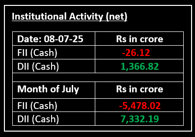 On July 8, the benchmark equity indices bounced back from early losses to end higher, buoyed by optimism surrounding trade deals, strong cues from Asian markets and fresh foreign fund inflows. After trading in the red during the early session, the Sensex recovered nearly 400 points from its day's low to close at 83,707. Nifty also reversed its losses, ending above the 25,500 mark.
