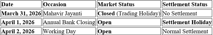 The week of March 30 is a truncated one for Dalal Street. While markets remain open on April 1, a settlement holiday due to bank closing will delay fund payouts and share deliveries. Here is what every trader and MF investor needs to know.