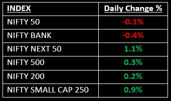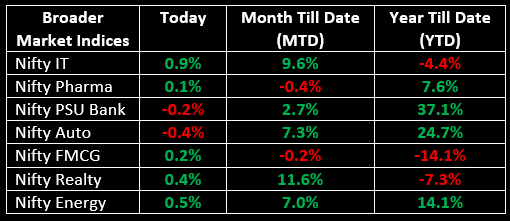 Despite weakness in frontline indices, the broader market outperformed, with the Nifty Midcap 100 index rising 0.6% and the Nifty Smallcap index gaining nearly 0.9%, indicating continued investor interest in mid and small-cap stocks.