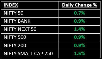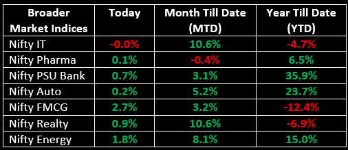 Broader indices outperformed the benchmark, with the Nifty Midcap index rising by 1.3% and the Smallcap index climbing 1.5%.
