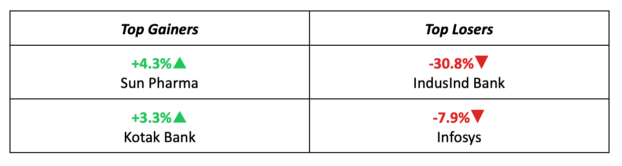 - IndusInd Bank was the biggest story of the week, with its stock plunging 30.8% amid mounting concerns.