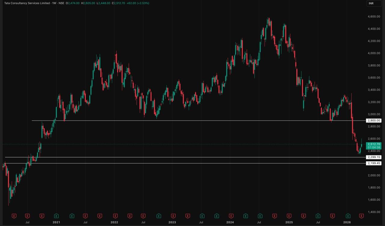 Our Technical Research Desk notes that TCS is currently showing a bearish short-to-medium-term structure on the weekly chart, having broken below the key support zone around ₹2,900.