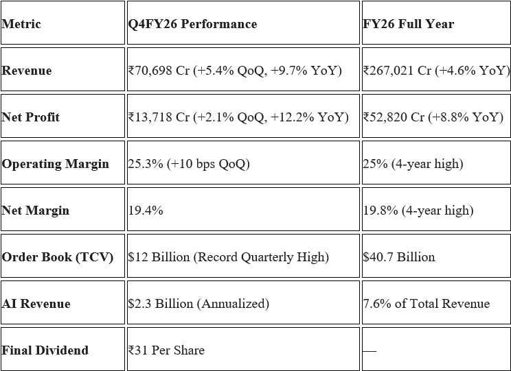 TCS reported an all-round performance with sequential revenue growth and multi-year high margins. The implementation of a wage revision in April 2026, combined with a record-breaking order book, provides high revenue visibility for FY27.