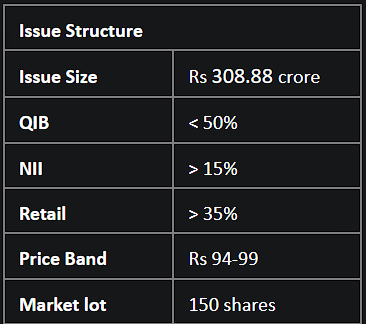 The IPO is entirely a fresh issue of up to 3.12 crore equity shares, valuing up to Rs 308.88 crore at the top of the price range. The price band for the IPO has been set at Rs 94–99 per share.