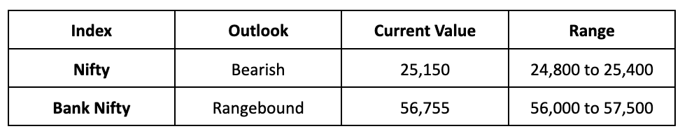- Unless positive surprises emerge from trade deals or earnings, we expect the Nifty to trend bearish next week, with a projected trading range between 24,800 and 25,400.