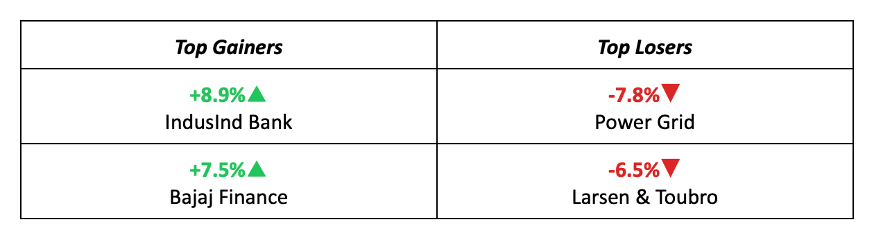 - IndusInd Bank led the gainers, climbing 8.9% last week, driven by optimism around its proposed Bharat Vikas Banking arm, which aims to tap into government support for rural growth.