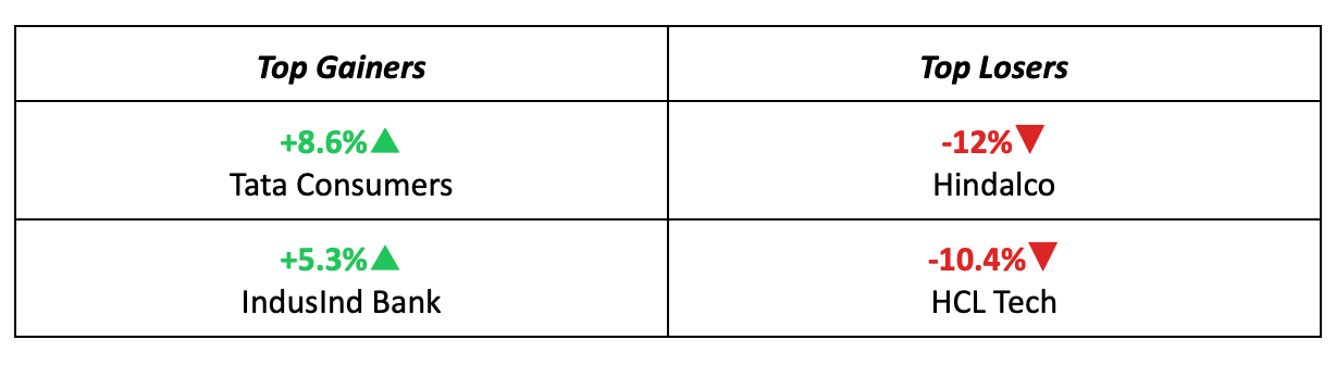 - Tata Consumer Products was the week’s top performer, with the stock surging 8.6% after Goldman Sachs upgraded it to a “Buy” rating, citing improving financials.