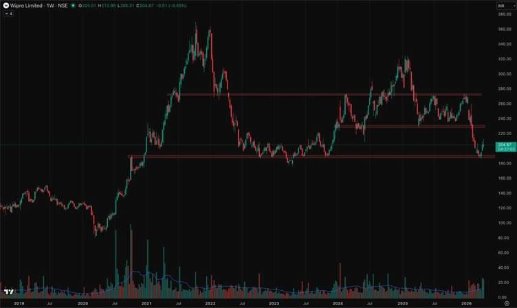 Our Technical Research Desk at Liquide observes Wipro trading near a critical long-term support zone of ₹185–₹190, following a sharp drop from the ₹270–₹280 resistance level.