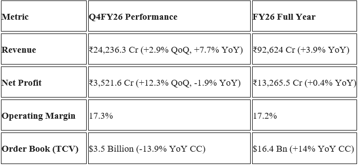 Wipro’s performance in the final quarter of FY26 was a "mixed bag." While revenues missed street estimates, the company managed to maintain operating margins at 17.3%, slightly above expectations due to operational efficiencies and one-off gains.