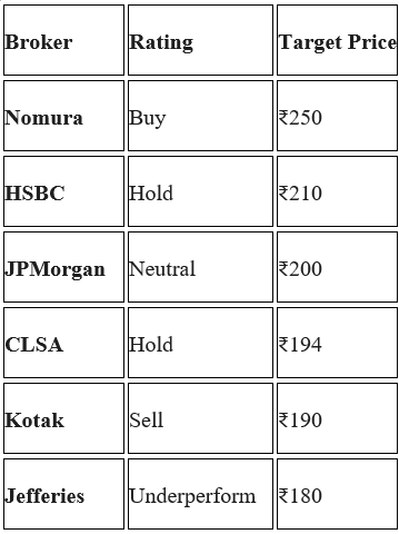 Post-Q4 results, analysts have issued a wide range of price targets. Nomura remains the most bullish with a target of ₹250. Conversely, Jefferies and Kotak have maintained "Underperform" and "Sell" ratings with targets ranging between ₹180 and ₹190, citing structural growth challenges.